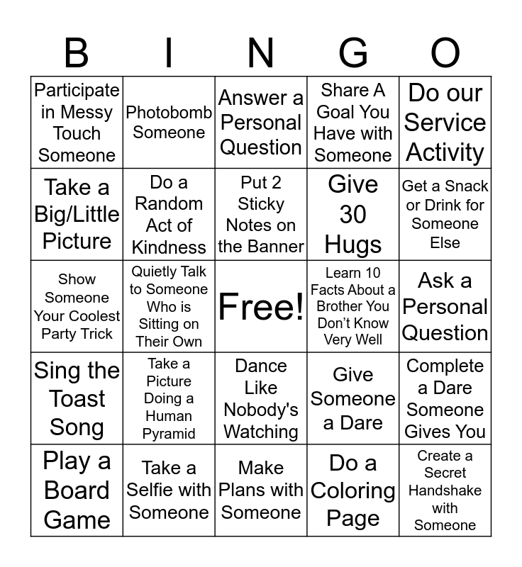 This bingo card has a free space and 24 words: Take a Picture Doing a Human Pyramid, Take a Selfie with Someone, Put 2 Sticky Notes on the Banner, Play a Board Game, Do our Service Activity, Participate in Messy Touch Someone, Take a Big/Little Picture, Photobomb Someone, Learn 10 Facts About a Brother You Don’t Know Very Well, Dance Like Nobody's Watching, Give 30 Hugs, Show Someone Your Coolest Party Trick, Give Someone a Dare, Complete a Dare Someone Gives You, Do a Random Act of Kindness, Do a Coloring Page, Ask a Personal Question, Answer a Personal Question, Get a Snack or Drink for Someone Else, Quietly Talk to Someone Who is Sitting on Their Own, Create a Secret Handshake with Someone, Sing the Toast Song, Share A Goal You Have with Someone and Make Plans with Someone.