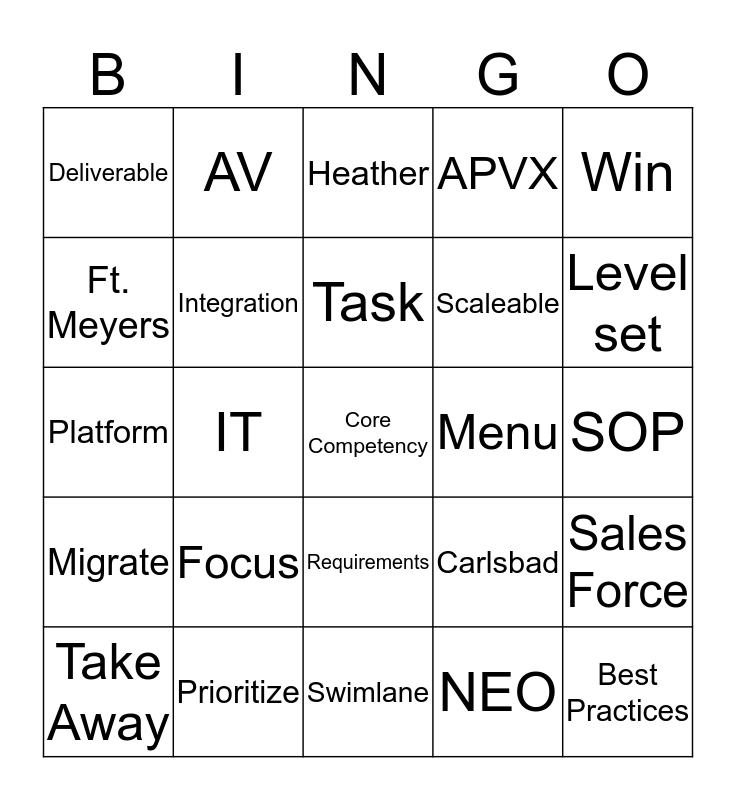 This bingo card has 30 words: Prioritize, Timeline, IT, Scope, Deliverable, Heather, Integration, Requirements, Menu, Swimlane, SOP, Core Competency, NEO, Best Practices, Level set, Cross walk, Carlsbad, Migrate, Focus, Win, Platform, Disciplines, AV, Scaleable, Ft. Meyers, APVX, Sales Force, Take Away, Task and Training.