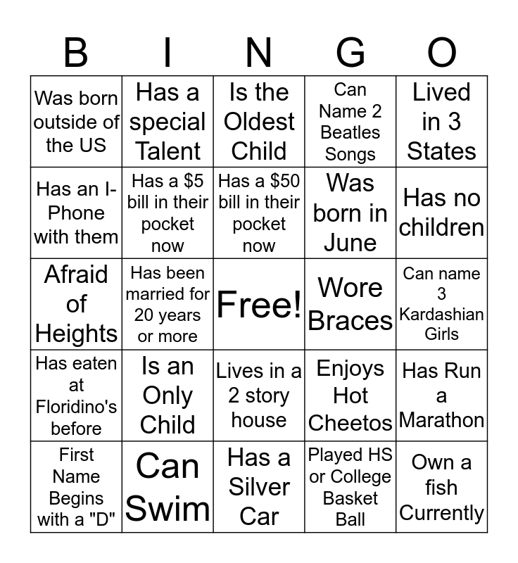 This bingo card has a free space and 44 words: Have 2 Pets, Own a fish Currently, Was born in January or February, First Name Begins with a "D", Was Born after 1980, Played HS or College Basket Ball, Is the Oldest Child, Likes Bananas, Lived in 3 States, Can Swim, Can Name 2 Beatles Songs, Wore Braces, Lives in a 2 story house, Is an Only Child, Has a Brother, Has a Silver Car, Was born in AZ, Afraid of Heights, Has used a member of the group this week, Has no children, Has a special Talent, Knows how to whistle, Plays the violin, Was born outside of the US, Has a family Owned Business, Can name 3 Kardashian Girls, Can name 2, Has a Sister, Enjoys Hot Cheetos, Has eaten at Floridino's before, Lives in Gilbert, Has Run a Marathon, Knows who invented the Light Bulb, Has visited NY in the last year, Has been married for 20 years or more, Drives a Chevy, Received Flowers or Candy for Valentine's Day, Was born in December, Has a $50 bill in their pocket now, Has an I-Phone with them, Was born in June, Has been to one of Stuart's Comedy Shows, Has a $5 bill in their pocket now and Has a nickname.