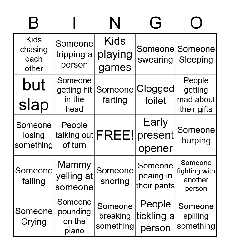 This bingo card has a free space and 24 words: Mammy yelling at someone, Someone pounding on the piano, Someone farting, Someone Crying, Someone Sleeping, Kids chasing each other, but slap, Someone tripping a person, Early present opener, Someone snoring, Clogged toilet, Someone losing something, Someone peaing in their pants, Someone fighting with another person, Someone getting hit in the head, People tickling a person, Someone burping, Kids playing games, People getting mad about their gifts, People talking out of turn, Someone spilling something, Someone falling, Someone swearing and Someone breaking something.