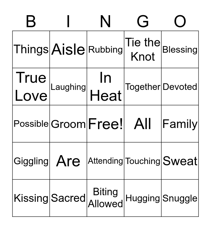 This bingo card has a free space and 29 words: Kissing, Bride, Groom, Party, Things, Rubbing, Laughing, Are, All, Sacred, Family, Snuggle, Biting Allowed, Hugging, Devoted, In God, Attending, Giggling, Blessing, Possible, Touching, Vow, Together, True Love, Tie the Knot, Aisle, Sweat, In Heat and Alter.
