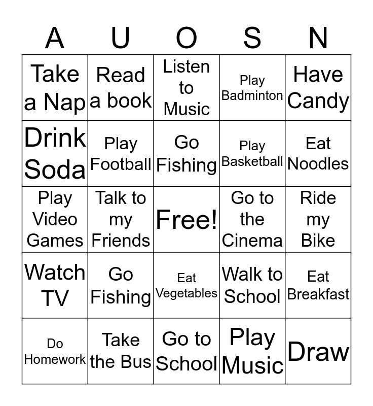 This bingo card has a free space and 27 words: Walk to School, Eat Durian, Play Basketball, Go to School, Drink Soda, Listen to Music, Read a book, Watch TV, Go to the Cinema, Eat Breakfast, Play Video Games, Play Badminton, Do Homework, Take the Bus, Eat Noodles, Speak English, Play Football, Go Fishing, Go Fishing, Take a Nap, Ride my Bike, Play Music, Talk to my Friends, Draw, Eat Vegetables, Have Candy and Do Karate.