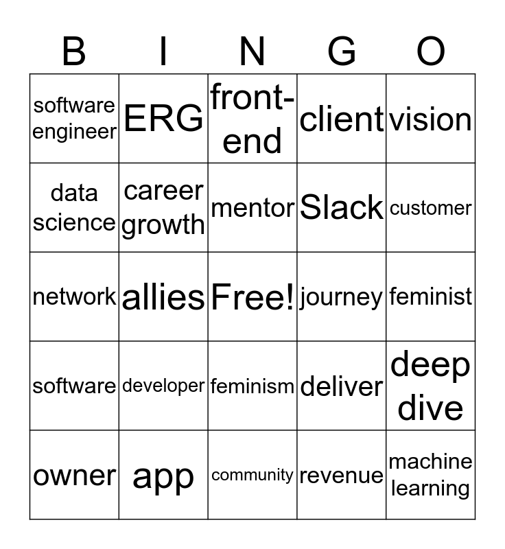 This bingo card has a free space and 105 words: best practice, initiative, vision, schedule, milestone, international, scale, performance, review, startup, senior hire, recruiting, B2B, B2C, enterprise, back-end, front-end, UX, UI, product, product manager, design, UX design, customer service, customer success, developer, customer, client, coding, cross-platform, deliver, revenue, money, pay gap, gender, incentive, leverage, value-add, mentor, app, engineer, software, data, data science, analyze, software engineer, AI, machine learning, sales, marketing, autonomy, autonomous, CEO, VP, Director, promotion, career, raise, salary, feminism, feminist, inclusion, diversity, equality, humility, humble, D&I, ERG, network, allies, community, support, sponsor, authenticity, vulnerability, transparency, Bay Area, San Francisco, owner, women in tech, Girl Geek, leader, leadership, career growth, career path, journey, education, unconventional, innovate, evolve, grow, learn, share, connect, deep dive, Sheryl Sandberg, Ellen Pao, Facebook, Slack, Google, Mozilla, Palo Alto Networks, Zoom, internet and website.
