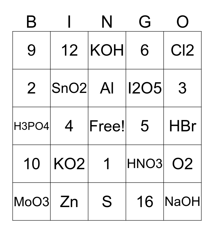 This bingo card has a free space and 25 words: KO2, S, Al, MoO3, Cl2, 9, 2, 12, 5, 1, I2O5, H3PO4, HNO3, O2, SnO2, H2O, HBr, KOH, 3, 4, NaOH, Zn, 10, 6 and 16.