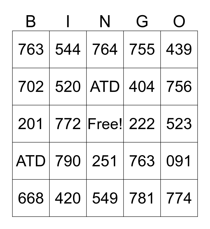 This bingo card has a free space and 24 words: 668, 790, ATD, 781, 439, 763, 544, 764, 222, 523, 201, 520, 763, 091, 702, 420, 549, 755, 756, ATD, 772, 251, 404 and 774.