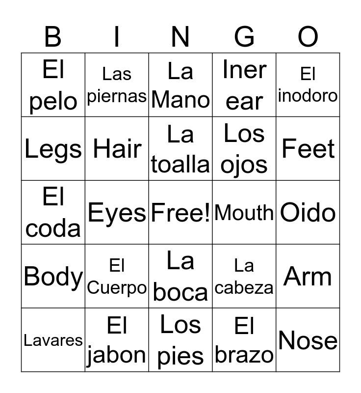This bingo card has a free space and 24 words: El Cuerpo, El jabon, La toalla, Lavares, El inodoro, El pelo, Legs, Las piernas, Mouth, La boca, Los ojos, El coda, La cabeza, Arm, Hair, El brazo, Oido, La Mano, Feet, Eyes, Nose, Body, Iner ear and Los pies.