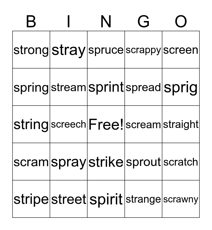 This bingo card has a free space and 24 words: spray, street, sprint, stripe, screen, strong, spring, stray, scream, strike, spread, string, sprout, scratch, stream, strange, straight, spruce, sprig, screech, scrawny, scram, scrappy and spirit.