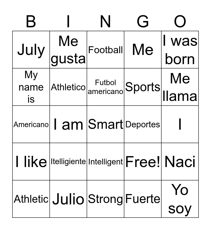 This bingo card has 25 words: Itelligiente, Strong, Futbol americano, Athletic, I was born, July, My name is, Me gusta, Deportes, Intelligent, Sports, Americano, Free!, Naci, Athletico, Yo soy, I, Football, Me llama, I am, Smart, Julio, I like, Me and Fuerte.