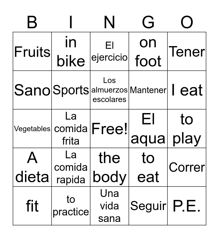 This bingo card has a free space and 24 words: La comida rapida, to practice, Los almuerzos escolares, fit, Tener, Fruits, Sano, in bike, El aqua, the body, Mantener, Vegetables, to eat, Correr, Sports, Seguir, to play, El ejercicio, I eat, La comida frita, P.E., A dieta, on foot and Una vida sana.