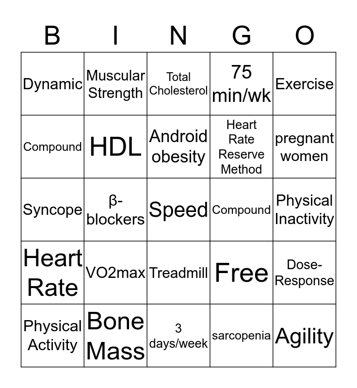This bingo card has a free space and 32 words: sarcopenia, Informed Consent, β-blockers, Flexibility, Heart Rate, HDL, Exercise, Dose- Response, Muscular Strength, 2-3 d/week, Android obesity, Total Cholesterol, Balance, Metabolic, Compound, waist-to-hip ratio, Physical Activity, Syncope, Treadmill, VO2max, Free, 150 min/wk, Physical Inactivity, Bone Mass, Agility, 75 min/wk, Heart Rate Reserve Method, Compound, Dynamic, 3 days/week, 6 min. walk test and pregnant women.