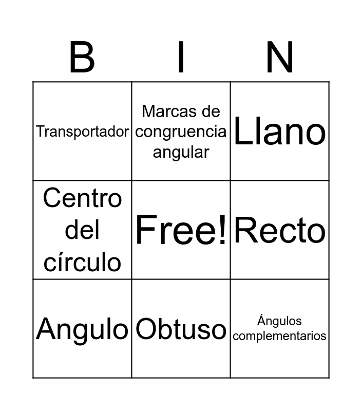 This bingo card has a free space and 14 words: Agudo, Ángulos adyacentes, Angulo, Marcas de congruencia angular, Centro del círculo, Ángulos complementarios, Angular congruente, Grado, Obtuso, Transportador, Rayo, Recto, Llano and Ángulos suplementarios.
