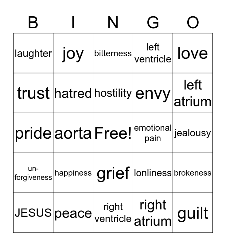 This bingo card has a free space and 24 words: happiness, peace, hostility, JESUS, love, laughter, trust, joy, emotional pain, grief, envy, pride, lonliness, brokeness, hatred, right atrium, jealousy, bitterness, left atrium, aorta, guilt, un- forgiveness, left ventricle and right ventricle.