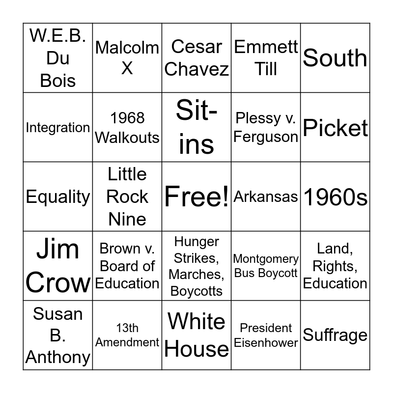 This bingo card has a free space and 55 words: 19th Amendment, Susan B. Anthony, MLK Jr., W.E.B. Du Bois, White House, Seneca Falls Convention, 1968 Walkouts, West, Plessy v. Ferguson, 1920, Emmett Till, Suffragist, Lincoln Memorial, Ernest Green, 1848, Own Property, South, Little Rock Nine, Protest, Suffrage, Arkansas, Assassinated, Montgomery Bus Boycott, Cesar Chavez, Wrote Articles, Sit-ins, President Eisenhower, Gov. Faubus, 1960s, Land, Rights, Education, Civil Rights Act of 1964, Lady Gaga, Dolores Huerta, Health Benefits and Unemployment, Integration, Equality, No Toilets, Low Wages, Long Hours, No Water, Jim Crow, Woodrow Wilson, Voting Rights Act of 1965, Malcolm X, National Farmworkers Association, Better Teachers, Better Buildings, Chicano studies classes, Vote, Brown v. Board of Education, 13th Amendment, Night of Terror, 14th Amendment, White Men, Picket, Segregation, Grape Boycott, Nonviolence, Hunger Strikes, Marches, Boycotts and Upset about end of Civil War/Idea of Equality.