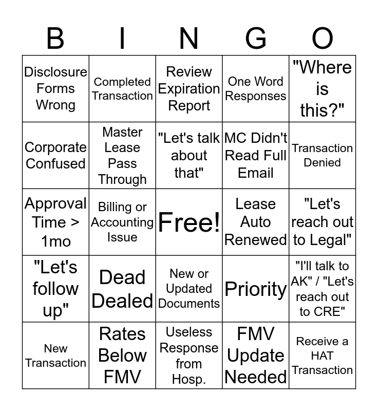 This bingo card has a free space and 36 words: Tenant Entity Changes, Hospital Misses Standing Call, Rates Above FMV, Master Lease Pass Through, Priority, "Let's follow up", "Let's talk about that", New Point of Contact, "Where is this?", "Let's reach out", Billing or Accounting Issue, One Word Responses, Changes to an Approved Lease, Lease Auto Renewed, Transaction Denied, Disclosure Forms Wrong, "What do you got?", Dead Dealed, Receive a HAT Transaction, Review Expiration Report, "Let's reach out to Legal", "I'll talk to AK" / "Let's reach out to CRE", Rates Below FMV, New Transaction, Useless Response from Hosp., Completed Transaction, Approval Time > 1mo, Hosp. F/Up on Clinic Lease, MC Didn't Read Full Email, Corporate Confused, "I'll have to call you back", SRG Update Needed, FMV Update Needed, New or Updated Documents, "Keep on your RADAR" and RUSH Request.