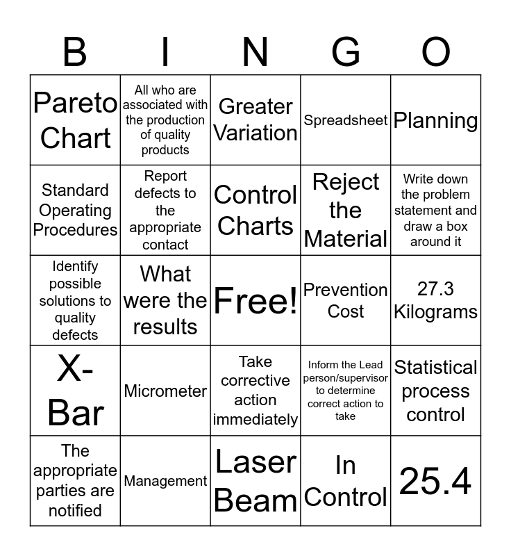 This bingo card has a free space and 34 words: Control Chart, In Control, Product Process and System, Eliminating quality variances, X-Bar, Report defects to the appropriate contact, Planning, The appropriate parties are notified, All who are associated with the production of quality products, Form,Profile,Orientation, Location and runout, Control Charts, Greater Variation, Control Chart, Yes, It is out of Spec, Prevention Cost, Write down the problem statement and draw a box around it, Management, Identify possible solutions to quality defects, Micrometer, Inform the Lead person/supervisor to determine correct action to take, Take corrective action immediately, Documents standards written within and Organization, Pareto Chart, 27.3 Kilograms, Laser Beam, 25.4, Spreadsheet, The Quality Assurance Rep, Reject the Material, Standard Operating Procedures, Calibration, What were the results, Statistical process control and Gage block.
