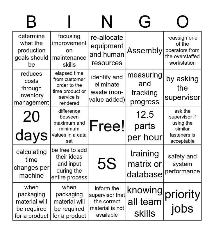 This bingo card has a free space and 34 words: the company's business plan, knowing all team skills, something that limits system throughput, root cause analysis, calculating time changes per machine, elapsed time from customer order to the time product or service is rendered, reassign one of the operators from the overstaffed workstation, when packaging material will be required for a product, focusing improvement on maintenance skills, part level number, identify and eliminate waste (non-value added), re-allocate equipment and human resources, build a team of like minded people, mechanical breakdown, 12.5 parts per hour, by asking the supervisor, when packaging material will be required for a product, 20 days, be free to add their ideas and input during the entire process, training matrix or database, 5S, establishing direction, aligning people, and motivating and inspiring others, determine what the production goals should be, ask the supervisor if using the similar fasteners is acceptable, inform the supervisor that the correct material is not available, priority jobs, Assembly, 2.205 inches, measuring and tracking progress, reduces costs through inventory management, units produced/hours worked, difference between maximum and minimum values in a data set, safety and system performance and 1.788 inches.