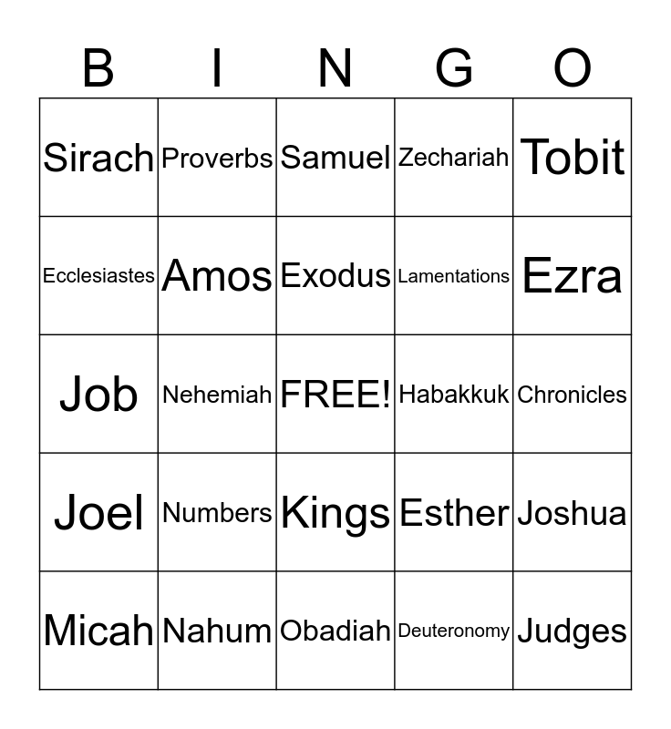 This bingo card has a free space and 42 words: Genesis, Exodus, Leviticus, Numbers, Deuteronomy, Joshua, Judges, Ruth, Samuel, Kings, Chronicles, Ezra, Nehemiah, Tobit, Judith, Esther, Maccabees, Job, Psalms, Proverbs, Ecclesiastes, Song of Songs, Wisdom, Sirach, Isaiah, Jeremiah, Lamentations, Baruch, Ezekiel, Daniel, Hosea, Joel, Amos, Obadiah, Jonah, Micah, Nahum, Habakkuk, Zephaniah, Haggai, Zechariah and Malachi.