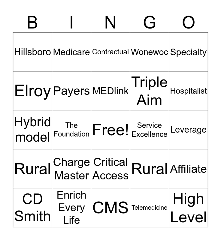 This bingo card has a free space and 29 words: CD Smith, Executive Committee, The Foundation, Capital Campaign, Hillsboro, Contractual, Payers, Charge Master, Service Excellence, Enrich Every Life, Leverage, High Level, CMS, Telemedicine, Hospitalist, Associate Staff, Critical Access, Rural, Specialty, Hybrid model, Rural, Regional, Triple Aim, Elroy, Wonewoc, Medicare, Affiliate, MEDlink and Medical Staff.