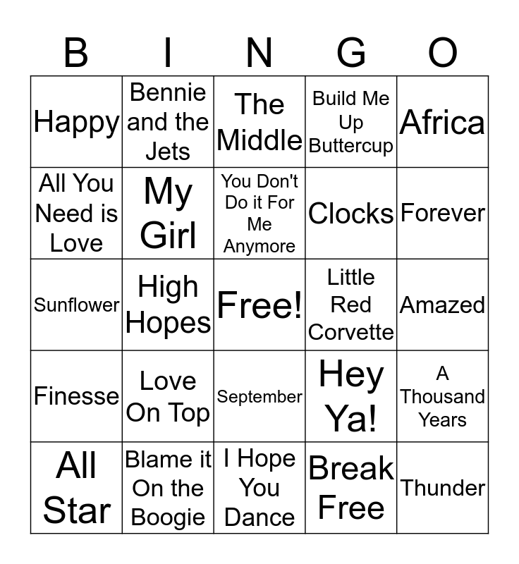 This bingo card has a free space and 24 words: Love On Top, Blame it On the Boogie, You Don't Do it For Me Anymore, All Star, Africa, Happy, All You Need is Love, Bennie and the Jets, Little Red Corvette, September, Clocks, Sunflower, Hey Ya!, A Thousand Years, My Girl, Break Free, Amazed, The Middle, Forever, High Hopes, Thunder, Finesse, Build Me Up Buttercup and I Hope You Dance.