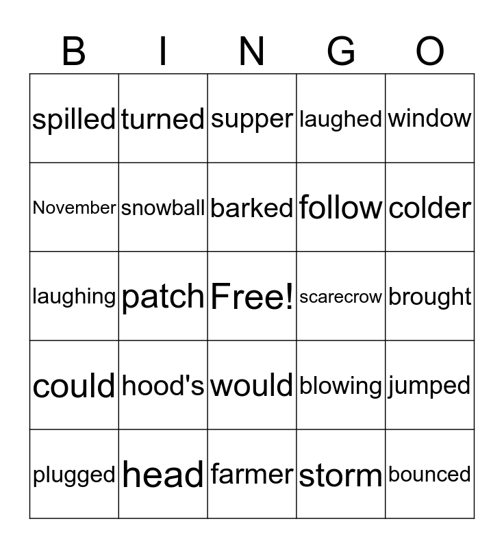 This bingo card has a free space and 31 words: farmer, garden, patch, video, spilled, supper, snowball, blowing, scarecrow, storm, brought, bounced, we'll, been, colder, bring, jumped, hood's, could, would, window, warm, plugged, turned, follow, November, laughed, laughing, head, barked and harder.