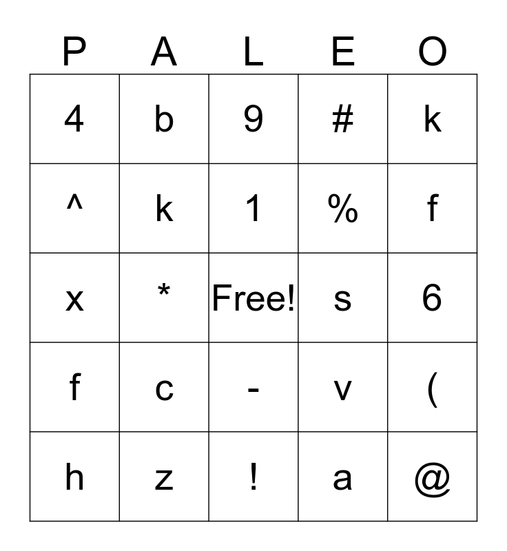 This bingo card has a free space and 34 words: f, a, d, 2, f, k, k, h, b, m, 1, 9, 0, p, s, f, z, x, c, v, -, 9, 4, 6, !, @, #, $, %, ^, &, *, ( and =.