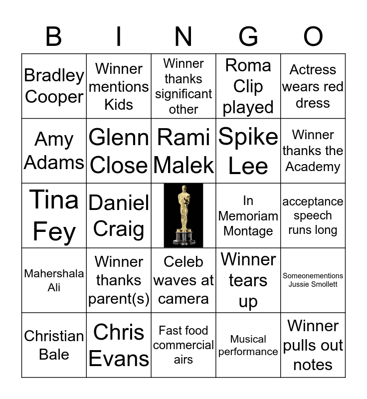 This bingo card has a free space and 29 words: Christian Bale, Kiss on camera, Daniel Craig, Someone wears a bowtie, Bradley Cooper, Winner thanks significant other, Glenn Close, Winner thanks parent(s), In Memoriam Montage, Chris Evans, acceptance speech runs long, Winner pulls out notes, Fast food commercial airs, Musical performance, Winner thanks the Academy, Lady Gaga, Celeb waves at camera, Mahershala Ali, Actress wears red dress, Tina Fey, Winner tears up, 3+ people on stage to accept award, Spike Lee, Amy Adams, Roma Clip played, Winner mentions Kids, Someonementions Jussie Smollett, Rami Malek and Melissa McCarthy.