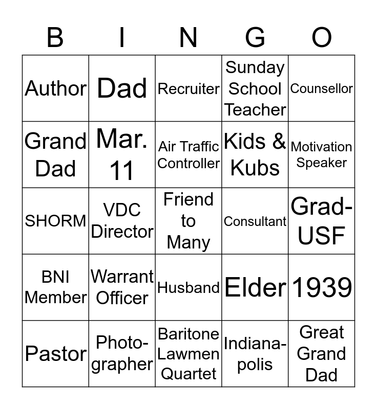 This bingo card has a free space and 24 words: Warrant Officer, Photo- grapher, Air Traffic Controller, Pastor, Counsellor, Author, Grand Dad, Dad, Consultant, Husband, Kids & Kubs, SHORM, Elder, 1939, Mar. 11, Indiana- polis, Grad-USF, Recruiter, Motivation Speaker, VDC Director, Great Grand Dad, BNI Member, Sunday School Teacher and Baritone Lawmen Quartet.