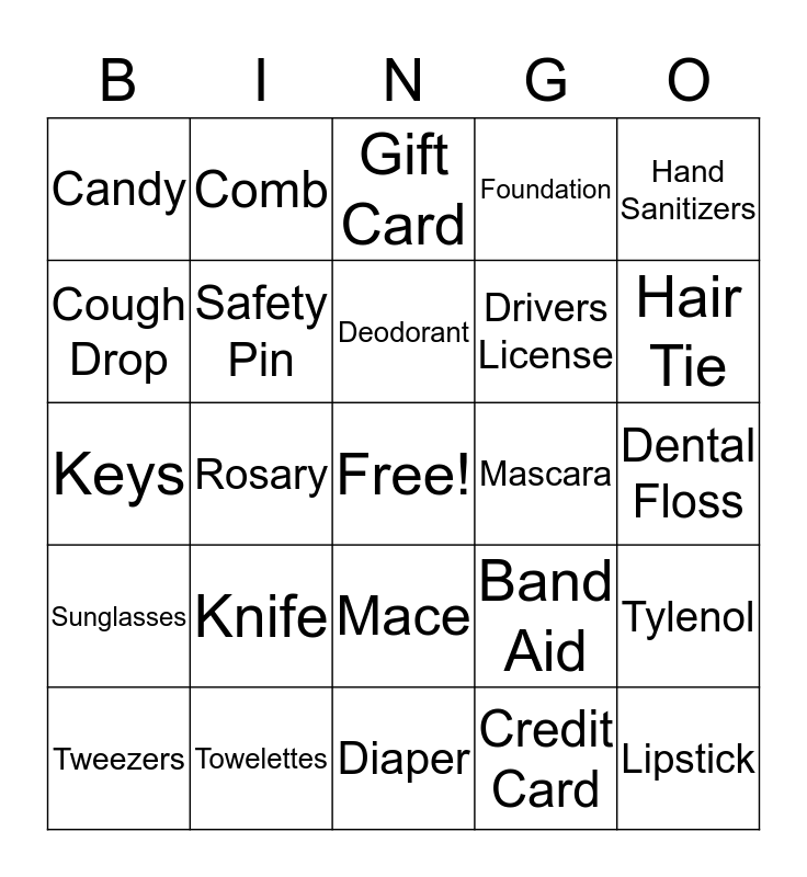 This bingo card has a free space and 44 words: Wallet, Lipstick, Nail Clippers, Tweezers, Coins, Credit Card, Gift Card, Cash, Hand Sanitizers, Towelettes, Foundation, Mascara, Mace, Knife, Flashlight, Diaper, Book, Keys, Lotion, Hair Tie, Comb, Brush, Gum, Candy, Checkbook, Dental Floss, Pen, Pencil, Band Aid, Sunglasses, Notepad, Tylenol, Earrings, Necklace, Rosary, Perfume, Phone, Receipt, Deodorant, Cough Drop, Drivers License, Movie Ticket Stub, Safety Pin and Water.