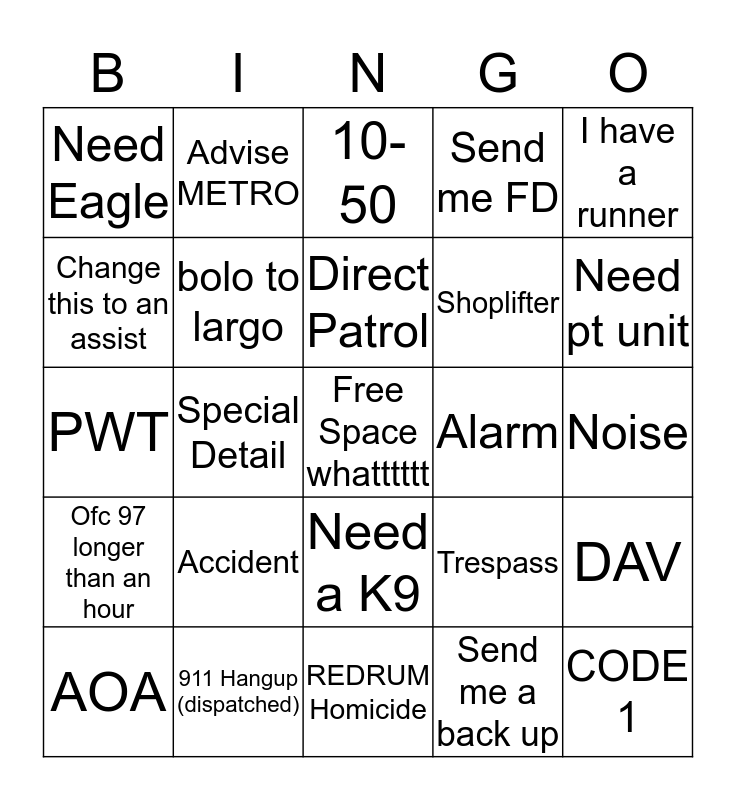 This bingo card has a free space and 44 words: CODE 4, CODE 1, Overdose, AOA, "Clear me", Send me a back up, 10-50, Can you call the compl, I have a runner, 911 Hangup (dispatched), Send me FD, Alarm, Need a K9, Accident, Domestic, REDRUM Homicide, Welfare Check, PWT, 10-15, Need pt unit, Advise METRO, Need Cell Phone pinged, Bike Stop, Need Eagle, Intox person, Noise, Susp Person, Directed Patrol, Trespass, Ofc 97 longer than an hour, Runaway, DAV, Secondary x20, Call themselves wrong unit #, Special Detail, 10-7, Need Sunstar (BA52), Do a Radio lunch break, Direct Patrol, Change this to an assist, Shoplifter, Bolo something, bolo to largo and bolo to pcso.