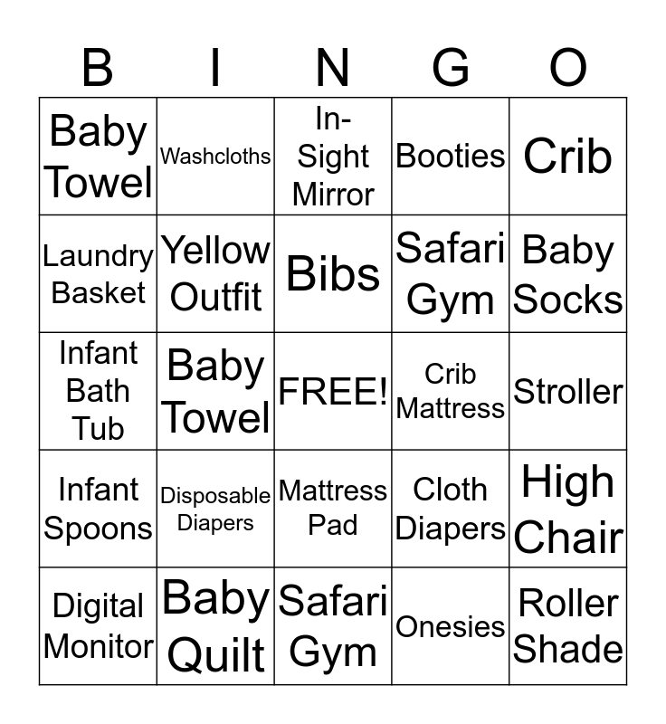 This bingo card has a free space and 24 words: Disposable Diapers, Baby Quilt, Bibs, Digital Monitor, Crib, Baby Towel, Laundry Basket, Washcloths, Crib Mattress, Mattress Pad, Safari Gym, Infant Bath Tub, Cloth Diapers, High Chair, Yellow Outfit, Onesies, Stroller, In-Sight Mirror, Baby Socks, Baby Towel, Roller Shade, Infant Spoons, Booties and Safari Gym.