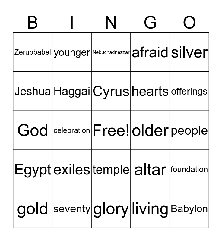 This bingo card has a free space and 24 words: exiles, seventy, Cyrus, gold, silver, Zerubbabel, Jeshua, younger, older, temple, hearts, God, altar, foundation, Haggai, living, people, Nebuchadnezzar, offerings, celebration, Babylon, Egypt, afraid and glory.