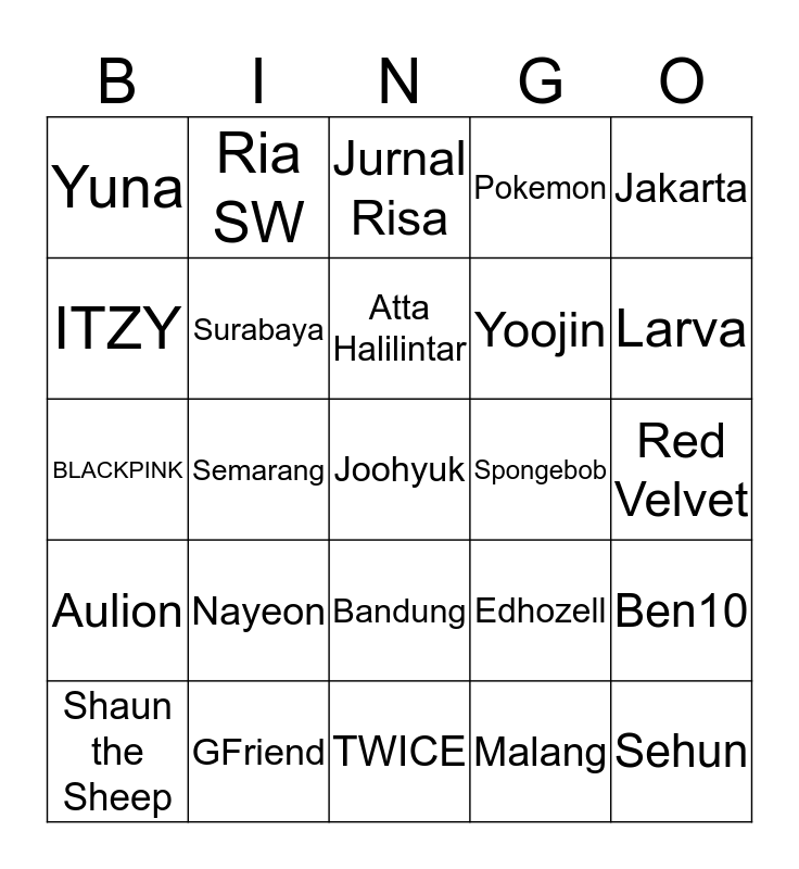 This bingo card has 25 words: Nayeon, TWICE, Atta Halilintar, Shaun the Sheep, Jakarta, Yuna, ITZY, Ria SW, Spongebob, Bandung, Yoojin, BLACKPINK, Edhozell, Ben10, Surabaya, Sehun, Red Velvet, Jurnal Risa, Larva, Semarang, Joohyuk, GFriend, Aulion, Pokemon and Malang.