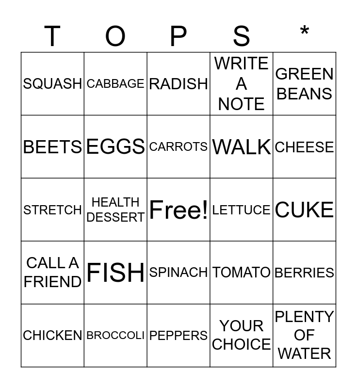 This bingo card has a free space and 24 words: FISH, BROCCOLI, CARROTS, CHICKEN, GREEN BEANS, SQUASH, BEETS, CABBAGE, LETTUCE, SPINACH, WALK, STRETCH, TOMATO, BERRIES, EGGS, YOUR CHOICE, CUKE, RADISH, CHEESE, HEALTH DESSERT, PLENTY OF WATER, CALL A FRIEND, WRITE A NOTE and PEPPERS.