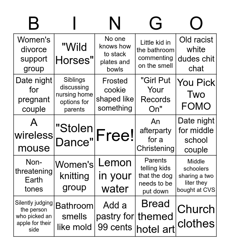 This bingo card has a free space and 24 words: Women's knitting group, Bathroom smells like mold, Frosted cookie shaped like something, Silently judging the person who picked an apple for their side, Old racist white dudes chit chat, Women's divorce support group, Date night for pregnant couple, "Wild Horses", An afterparty for a Christening, Lemon in your water, "Girl Put Your Records On", A wireless mouse, Parents telling kids that the dog needs to be put down, Middle schoolers sharing a two liter they bought at CVS, Siblings discussing nursing home options for parents, Bread themed hotel art, Date night for middle school couple, No one knows how to stack plates and bowls, You Pick Two FOMO, "Stolen Dance", Church clothes, Non-threatening Earth tones, Little kid in the bathroom commenting on the smell and Add a pastry for 99 cents.