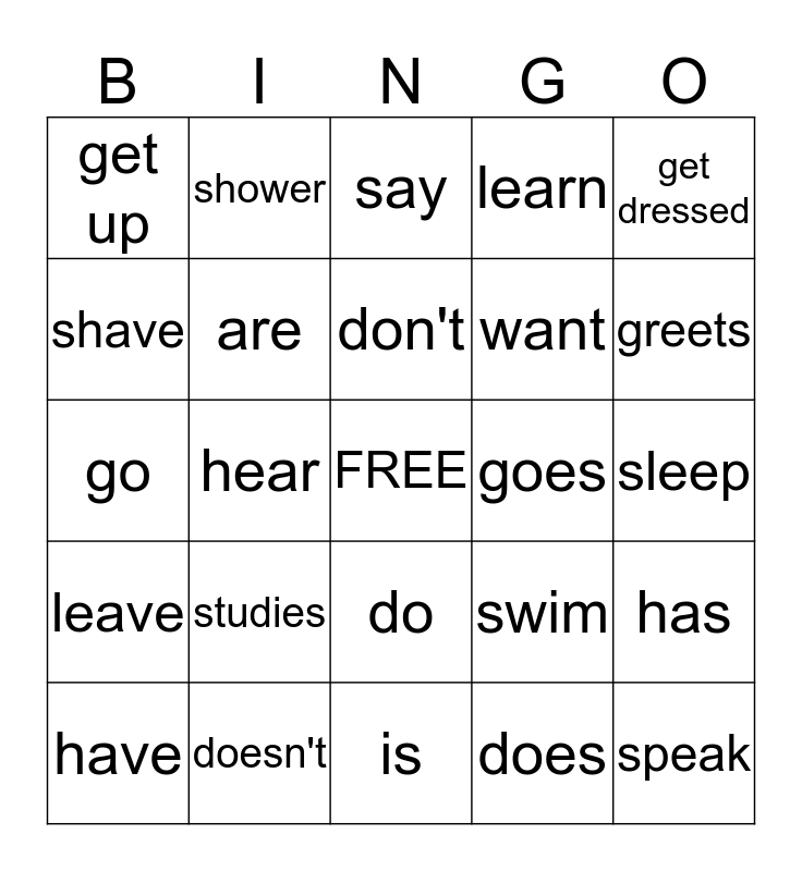 This bingo card has a free space and 26 words: do, does, don't, doesn't, get dressed, get up, shave, shower, sleep, swim, want, go, has, have, hear, know, learn, leave, say, speak, greets, is, goes, studies, are and writes.