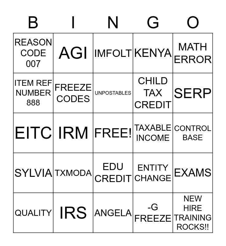 This bingo card has a free space and 24 words: TXMODA, IRS, UNPOSTABLES, QUALITY, MATH ERROR, REASON CODE 007, ITEM REF NUMBER 888, AGI, TAXABLE INCOME, EDU CREDIT, CHILD TAX CREDIT, EITC, ENTITY CHANGE, EXAMS, FREEZE CODES, -G FREEZE, CONTROL BASE, IMFOLT, SERP, IRM, NEW HIRE TRAINING ROCKS!!, SYLVIA, KENYA and ANGELA.