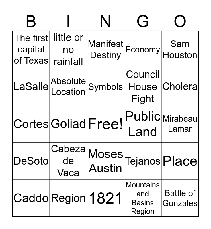 This bingo card has a free space and 29 words: Caddo, 1836, Goliad, Land Agent, The first capital of Texas, Manifest Destiny, Absolute Location, Cabeza de Vaca, Public Land, Region, Mirabeau Lamar, Battle of Gonzales, 1821, Mountains and Basins Region, Cholera, Adams-Oni Treaty, Moses Austin, DeSoto, Sam Houston, Cortes, Tejanos, Spain's response to French explorers, Council House Fight, LaSalle, Economy, little or no rainfall, Place, Symbols and Mississippi River.