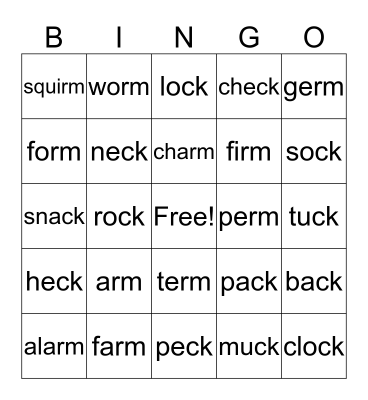 This bingo card has a free space and 24 words: arm, farm, charm, alarm, germ, squirm, form, worm, perm, term, firm, snack, pack, back, neck, muck, tuck, lock, sock, rock, clock, heck, check and peck.