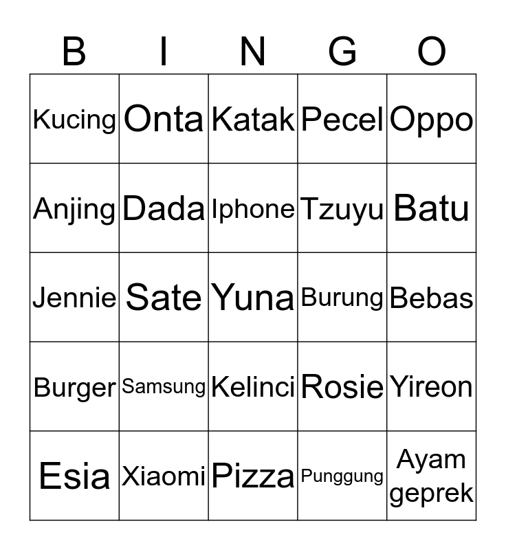 This bingo card has a free space and 24 words: Samsung, Xiaomi, Iphone, Esia, Oppo, Kucing, Anjing, Onta, Burung, Kelinci, Tzuyu, Jennie, Rosie, Yireon, Dada, Punggung, Bebas, Katak, Batu, Sate, Ayam geprek, Burger, Pecel and Pizza.