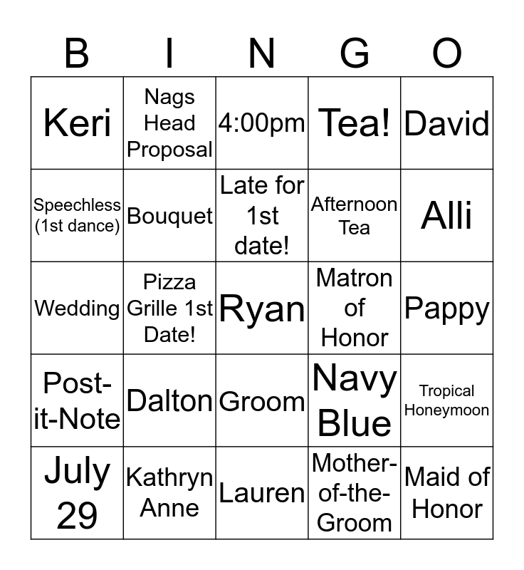This bingo card has a free space and 43 words: Jessica's Tearoom, Maid of Honor, Gift Registry, July 29, Bride, Mother-of-the-Groom, 4:00pm, Usher, David, Kathryn Anne, Tea!, Matron of Honor, Groom, Dalton, Norton, Lauren, Mother-of-the-Bride, Wedding, Best Man, Alli, Nags Head Proposal, Sarah, Father-of-the-Bride, Keri, Mary Brand, Pappy, I do!, Emily, Navy Blue, Post-it-Note, Chianti, Tropical Honeymoon, Bridesmaid, Pizza Grille 1st Date!, Katie Sims, Flyers, Hotel Bethlehem, Late for 1st date!, Speechless (1st dance), Afternoon Tea, Bridal shower, Bouquet and Babymoon.