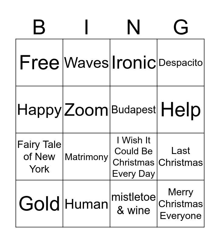 This bingo card has 58 words: ABC, baby love, Baby, Merry Christmas Everyone, Believe, christmas wrap, Budapest, Clair, Fairy Tale of New York, Delilah, Despacito, Fernando, Firework, Footloose, Frankie, Free, Gold, Happy, Heaven, Help, Human, Ironic, Driving Home For Christmas, Jump, Kiss, mistletoe & wine, Maniac, Maria, Matrimony, Mickey, rockin around the christmas tree, Do They Know It's Christmas, 1999, Reach, Rehab, Riptide, Rosegarden, Last Christmas, I Wish It Could Be Christmas Every Day, Shout, Sing, baby it's cold outside, Starships, Superstar., jingle bells, Toxic, Tragedy, Treasure, Valerie, Vertigo, Vogue, Wannabe, Wanted, Waterloo, Waves, YMCA, Zoom and Santa Tell Me.