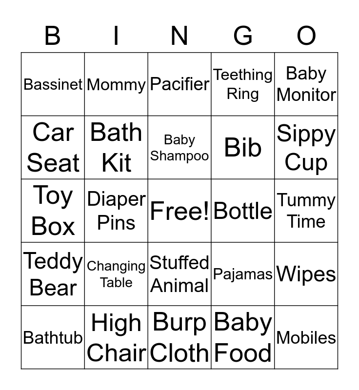 This bingo card has a free space and 59 words: Blanket, High Chair, Changing Pad, Teddy Bear, Baby Food, Diapers, Bath Kit, Baby Powder, Bib, Teether, Teething Ring, Stroller, Car Seat, Baby Lotion, Towel, Bassinet, Mobiles, Baby Monitor, Onesie, Baby Shampoo, Bottle, Pacifier, Bathtub, Wipes, Baby Sling, Rattle, Enzo, Washcloth, Sippy Cup, Ultrasound, Mittens, Nursery, Booties, Milk, Mommy, Daddy, Formula, Diaper Pins, Sleep Sack, Toy Box, Baby Socks, Changing Table, Tummy Time, Safety Gate, Nursing Pillow, Crib, Diaper Bag, Bouncy Seat, Stuffed Animal, Burp Cloth, Grandma, Grandpa, Auntie, Story Time, Maternity Leave, Pajamas, Dani, Well and Nasal Aspirator.