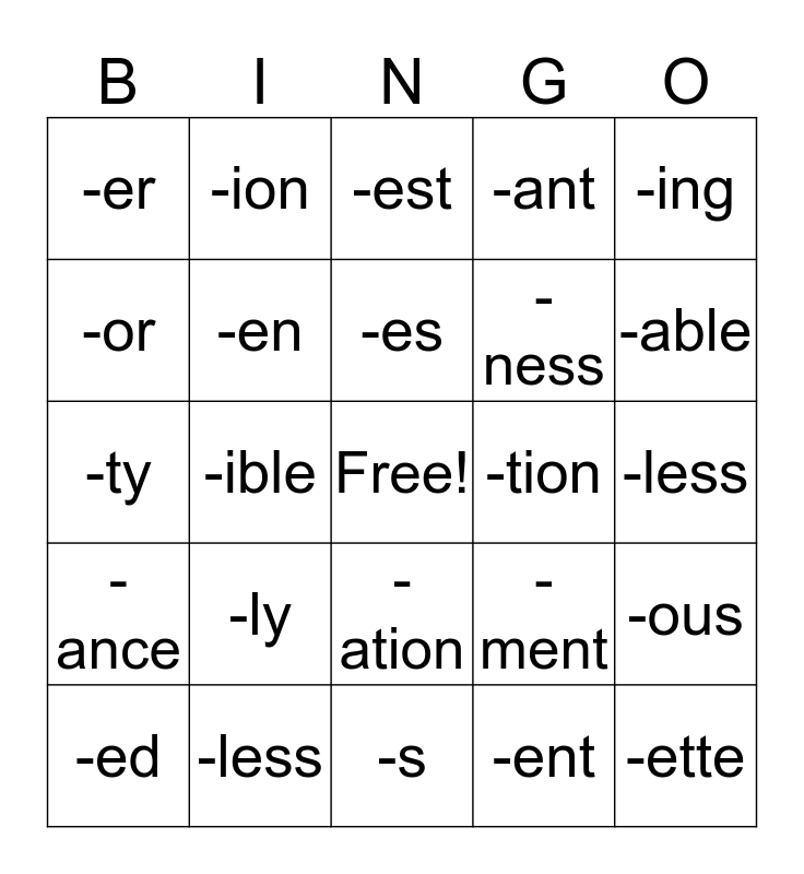 This bingo card has a free space and 25 words: -ly, -s, -es, -ed, -ing, -er, -or, -ion, -tion, -ation, -ness, -ty, -ment, -ous, -en, -ful, -less, -est, -able, -ible, -ette, -less, -ance, -ant and -ent.