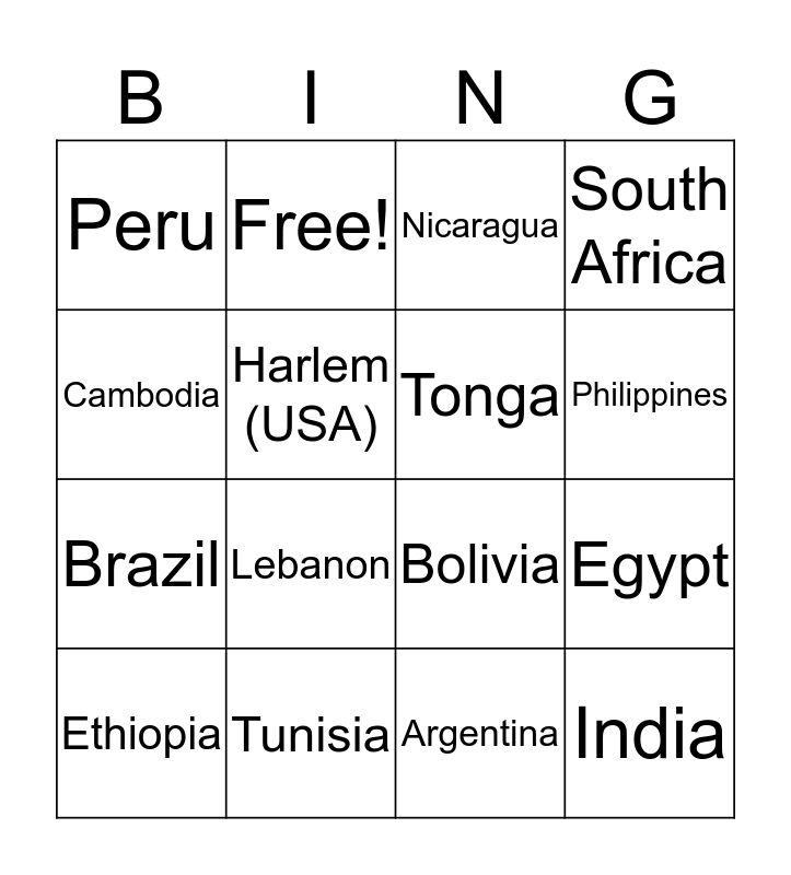 This bingo card has 16 words: Tunisia, Egypt, Nicaragua, Peru, Brazil, Free!, Bolivia, Argentina, Cambodia, Harlem (USA), Ethiopia, South Africa, Lebanon, Philippines, Tonga and India.
