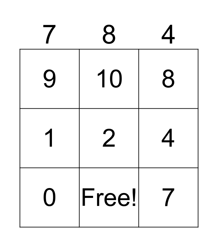 This bingo card has 10 words: Free!, 8, 9, 2, 1, 0, 10, 3, 4 and 7.