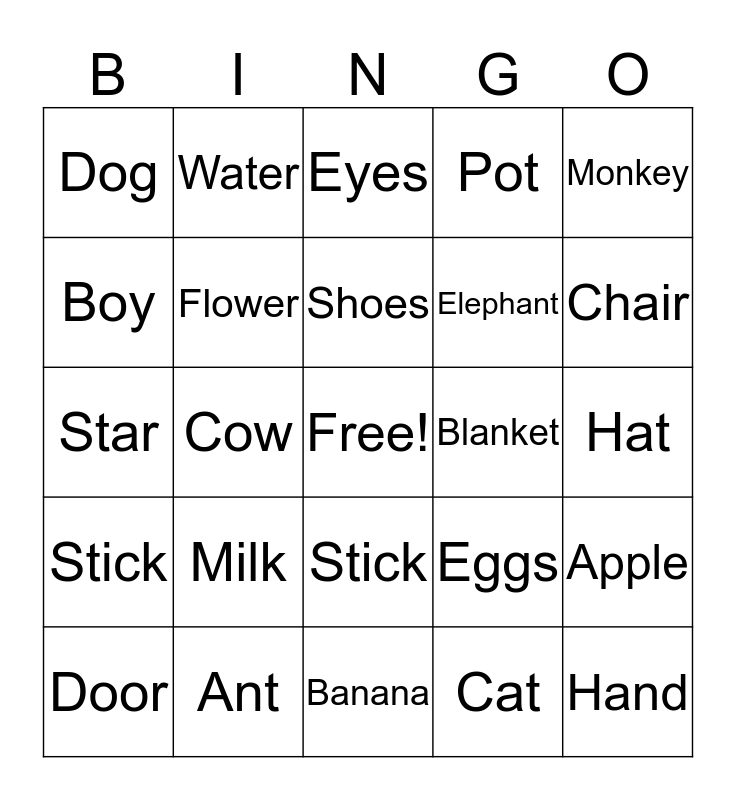 This bingo card has a free space and 49 words: Car, Hand, Hair, Banana, Milk, Spoon, Water, House, Boy, Girl, Flower, Pot, Apple, Eggs, Foot, Head, Shoes, Blanket, Fish, Monkey, Cow, Cat, Dog, Elephant, Snake, Chair, Door, Book, Stick, Stick, Grapes, Man, Woman, Bird, Ant, Snow, Rain, Umbrella, Hat, Bowl, Window, Spider, Frog, Mirror, Star, Eyes, Nose, Potato and Tea.