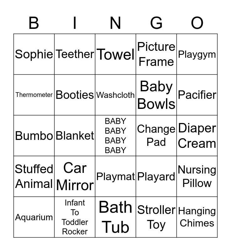 This bingo card has a free space and 32 words: Stroller Toy, Bottle, Blanket, Bib, Stuffed Animal, Booties, Playgym, Nursing Pillow, Teether, Receiving Blanket, Washcloth, Towel, Sippy Cup, Sterilizer, Change Pad, Alphabet Play Mat, Aquarium, Bumbo, Playmat, Car Mirror, Playard, Diaper Bag, Diaper Cream, Infant To Toddler Rocker, Hanging Chimes, Picture Frame, Baby Bowls, Thermometer, Sophie, Bath Tub, Rattle and Pacifier.