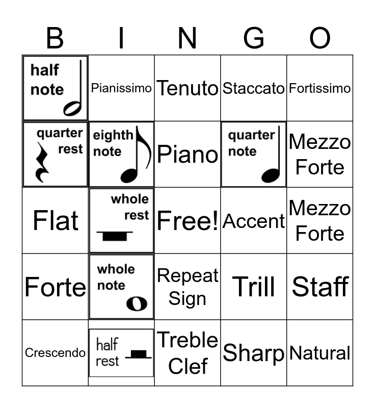 This bingo card has 7 images, a free space and 17 words: Piano, Crescendo, Fortissimo, Pianissimo, Accent, Repeat Sign, Flat, Trill, Staff, Sharp, Mezzo Forte, Tenuto, Mezzo Forte, Natural, Forte, Staccato and Treble Clef.