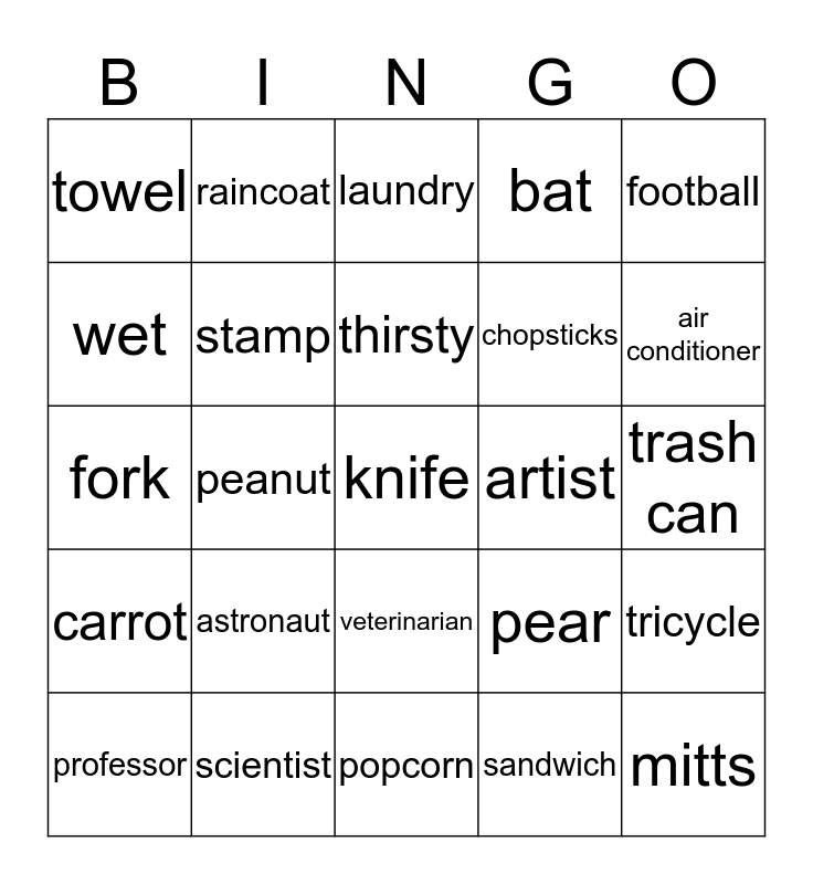 This bingo card has a free space and 24 words: astronaut, scientist, thirsty, professor, football, towel, wet, raincoat, artist, veterinarian, chopsticks, fork, pear, tricycle, stamp, sandwich, trash can, laundry, air conditioner, peanut, mitts, carrot, bat and popcorn.