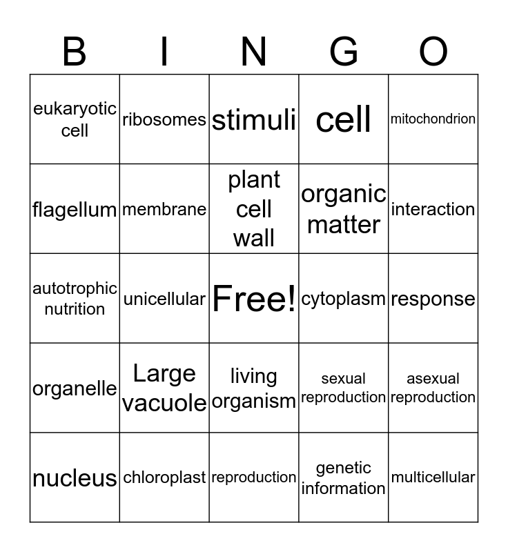 This bingo card has a free space and 24 words: Large vacuole, chloroplast, plant cell wall, nucleus, mitochondrion, eukaryotic cell, flagellum, ribosomes, cytoplasm, living organism, organic matter, autotrophic nutrition, sexual reproduction, asexual reproduction, membrane, genetic information, response, stimuli, interaction, unicellular, multicellular, organelle, cell and reproduction.